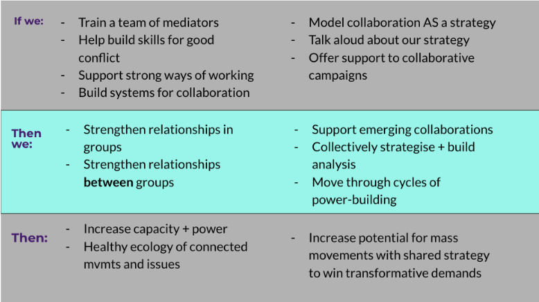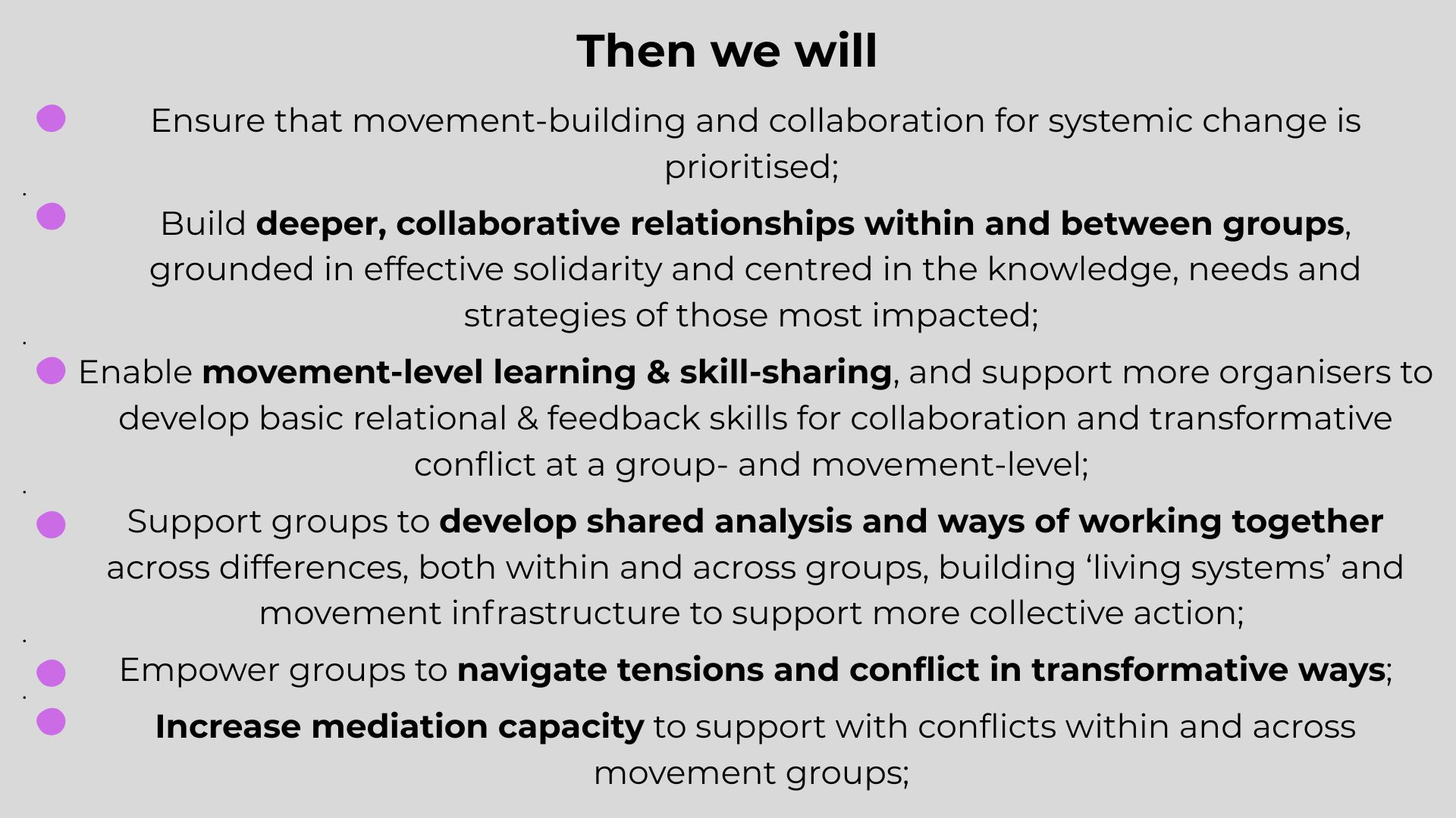 If you also are experimenting with different ways to do conflict, collaborating more deeply at strategic intersections, or if you see a clear connection with what we’re doing in the coming years, we want to hear from you!
