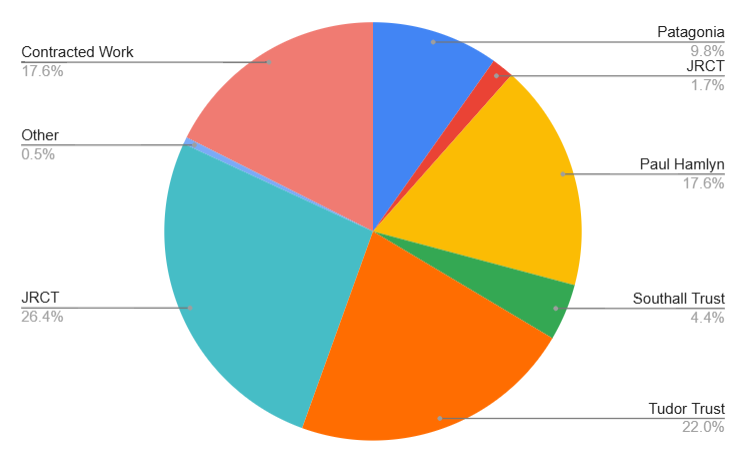 This chart illustrates what we receive from our current funders, the income we make due to the contracted work we offer on a sliding scale, as well as donations – all input into the whole resourcing of Tripod. We are grateful for these resources that allow us to offer subsidised training and facilitation, support partners through our movement building work, as well as pay our staff and collaborators an equitable and just wage.